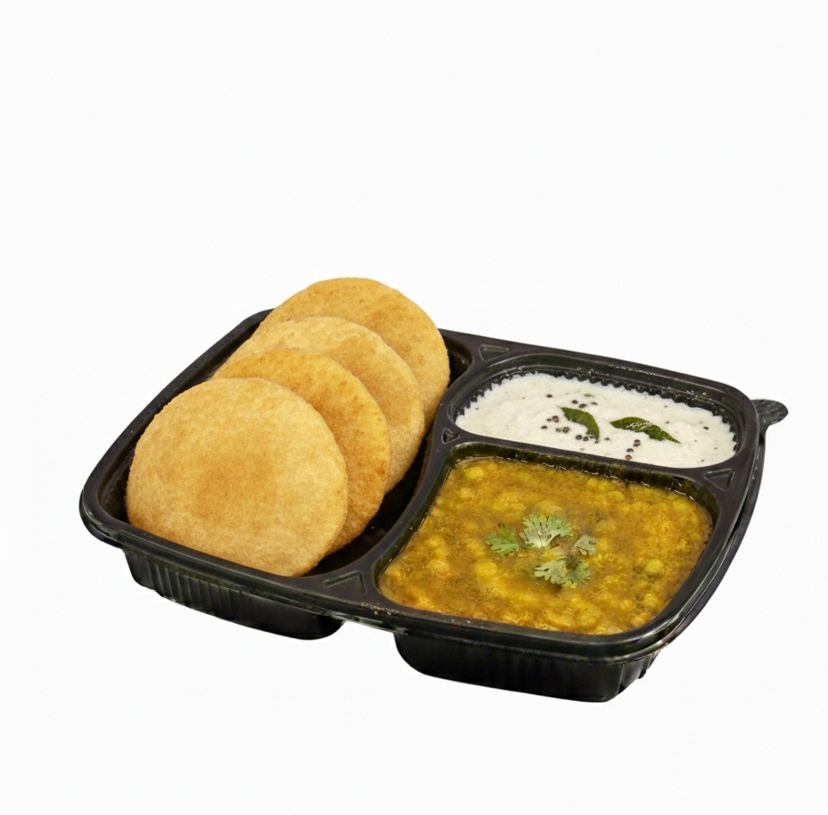 ପୁରି ୪ଟି , ଘୁଗୁନି ଏଵଂ ନଡ଼ିଆ ଚଟଣି । ପୁରା ଶୁଦ୍ଧତା ଏବଂ ଫୁଲ୍ ନିରାମିଷ।