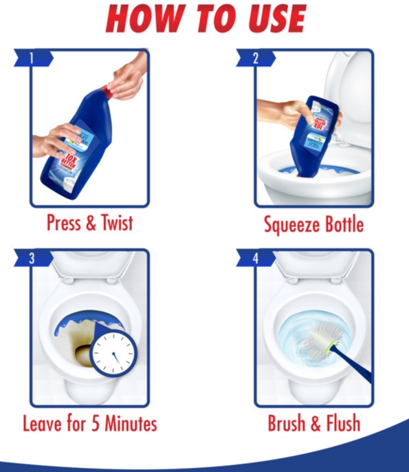 ବ୍ୟବହାର ବିଧି (How to Use) ଟଏଲେଟ୍ କମୋଡ୍‌ର ଚାରିପାଖରେ ଏହି ତରଳକୁ ଢାଳନ୍ତୁ। ୨୦ ମିନିଟ୍ ପର୍ଯ୍ୟନ୍ତ ଛାଡ଼ି ଦିଅନ୍ତୁ, ତା’ପରେ ବ୍ରଶ୍ ସାହାଯ୍ୟରେ ଘଷି ଫ୍ଲସ୍ (Flush) କରି ଦିଅନ୍ତୁ।